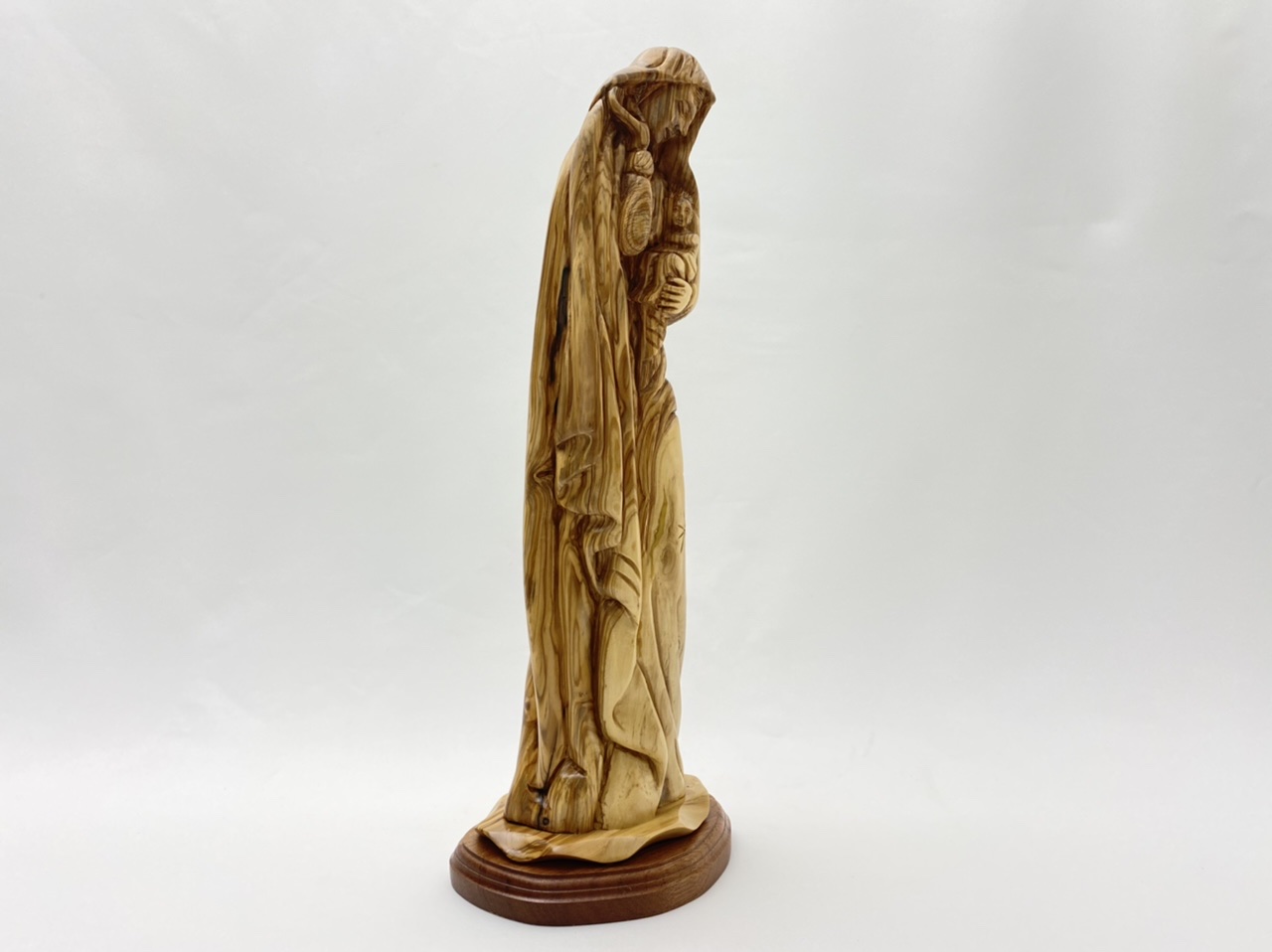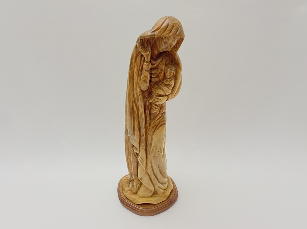 Virgin mother holding baby Jesus statue is made from one branch of olive wood. This statue was hand carved near the site where the Virgin Mother gave birth to our lord Jesus Christ. In it attached to a Mahogany base for a beautiful look. The ineradicable details of this statue shows the brilliant workmanship involved in producing it. provides great home decor, and is a great gift.